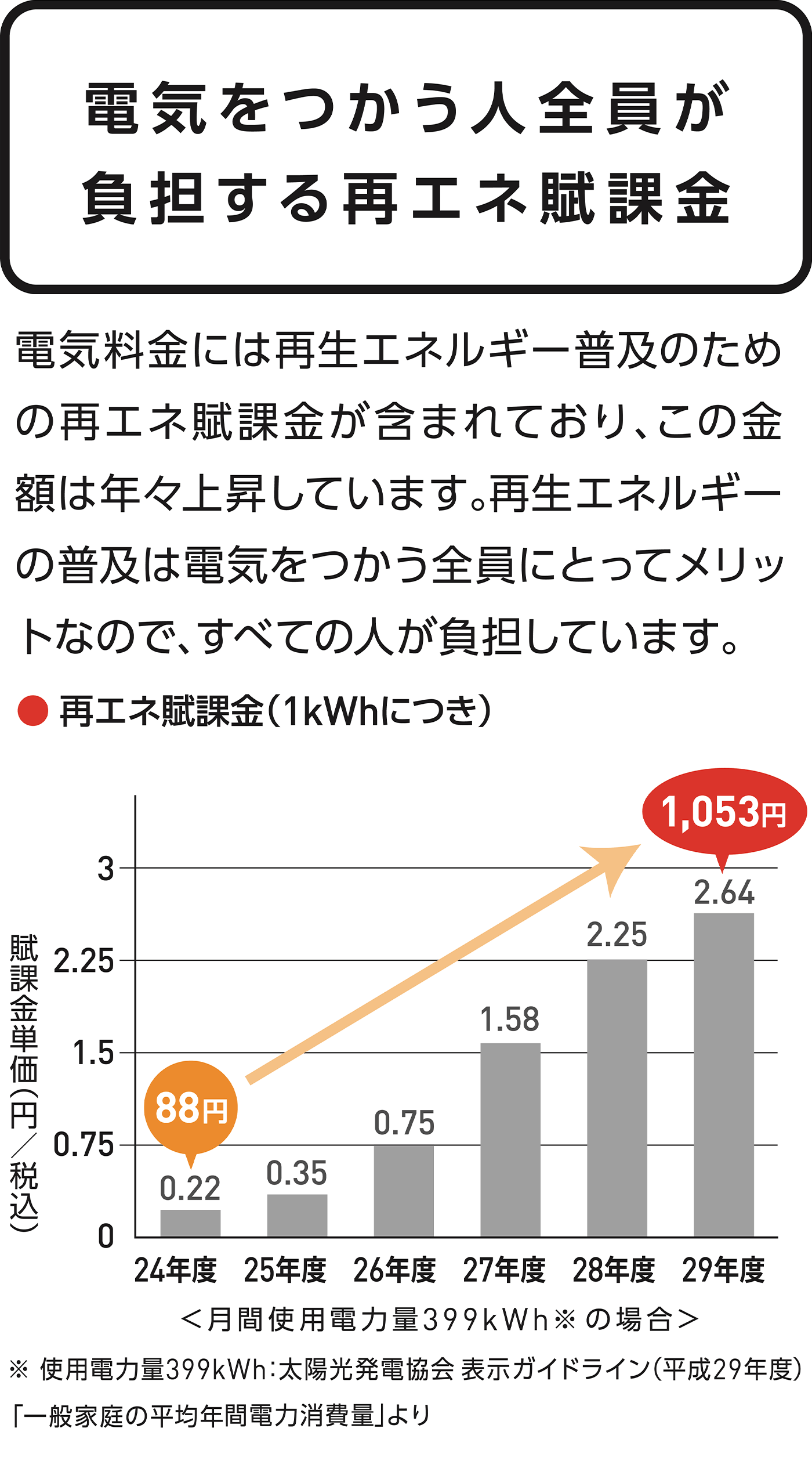 日本の再生可能エネルギー発電の導入を支えるため、再生可能エネルギーの固定価格買取制度が始まりました。そして電力会社が買い取る費用の一部を、電気使用者から賦課金として集めることになりました。